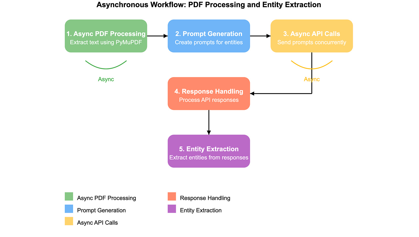 Once the PDF text has been extracted, multiple prompts for entity extraction are generated. Instead of sending API requests one by one, asynchronous tasks are created for each request and run concurrently using asyncio.gather()