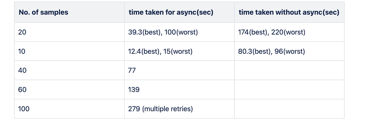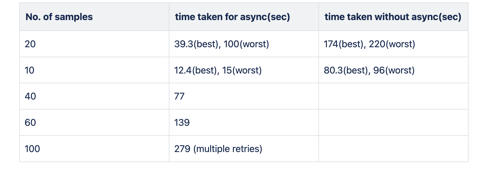 Above is a summary of the benchmark results, where the "Best" time represents the fastest extraction time recorded in multiple tests, and the "Worst" time represents the slowest. Benchmarking was halted as the number of PDFs increased due to cost and time constraints. However, the results clearly indicate that asynchronous functionality can provide a 2-3x increase in processing speed in typical scenarios.
